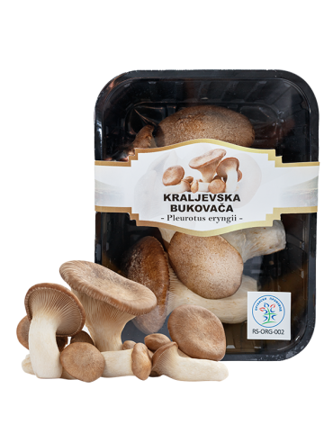 Organska Kraljevska bukovača, uzgajana u prirodnom okruženju jednakom svom prirodnom staništu u šumi. Ova gljiva ima veliku nutritivnu vrednost, koju prati vlaknasta struktura prepuna beta glukana, vitamina C, A, E, B1, B12, mineralima, Kalijuma, kalcijuma, fosfora. Sadrži i polisaharid za koji važi da deluje u prevenciji. Pogoduje zdravlju srca i imunološkog sistema, pomaže regulaciju šećera u krvi, reguliše nivo holesterola, jača kosti, ima protiv upalna svojstva I naravno bogata je antioksidansima. Kraljevska bukovača ima posebnu aromu I izraženi umami zbog čega je smatraju najukusnijiom pečurkom, omiljena je hrana vegana I vegetarijaca jer ima čvrstu strukturu I može da bude glavno jelo. Sprema se samostalno, pržena, pečena, grilovana ili pohovana, ili u potažima, varivima, sa testeninom, ili kao nadev za picu.